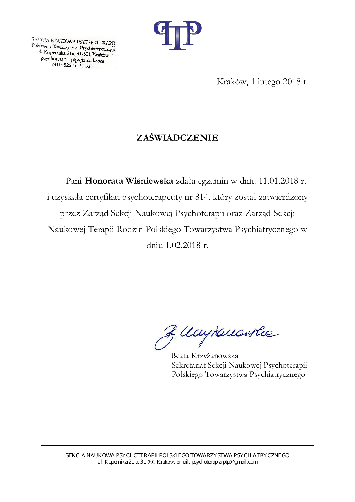 Ukończyłam 4,5 – letnie całościowe szkolenie z psychoterapii w Krakowie (wymagane do uzyskania certyfikatu). Ponadto szkoliłam się w Laboratorium Psychoedukacji i Polskim Instytucie Ericksonowskim. Odbyłam 360 – godzinny staż w Ambulatorium Terapii Rodzin w Klinice Psychiatrii Dzieci i Młodzieży Szpitala Uniwersyteckiego w Krakowie. Nieustannie doskonalę swój warsztat pracy poprzez udział w warsztatach i szkoleniach organizowanych m.in. przez Polski Instytut Ericksonowski (ostatnio: z terapii par oraz zastosowania hipnozy w psychoterapii – I i II stopień).